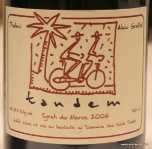 And he wasn’t wrong. My notes include jottings such as ‘Why am I here?’, ‘Oh dear’, and ‘Is it me or are all these crap?’ But then a few signs of light appeared. Yes, the Lumière and Kahina reds made by Depardieu and Bernard Magrez were significantly better than most. But better still were two wines from Thalvin. Aït Souala 2004, a blend of Arinarnoa, Tannat and Malbec, was on the oaky side, but had plenty of dusty rustic fruit tinged with notes of violets and chocolate (if you’ve never heard of it, Arinarnoa is a Merlot x Petit Verdot cross developed in France in the 1950s – first came across it at Casa Valduga in Brazil of all places). Equally fine was the 2006 Tandem Syrah (Called Syrocco in the US I think) which is made in conjunction with the wizard of Crozes Alain Graillot. It’s a blackcurranty, plummy Syrah with some meaty reduced aromas, with a hearty warmth befitting the warm climate, but a bright balanced finish too. What prompted this post is that I’ve just seen that the 2007 is available from Liz & Mike Berry at Les Vins Fins de la Crau for £14.95. More wines like this please Morocco, these two were lovely.